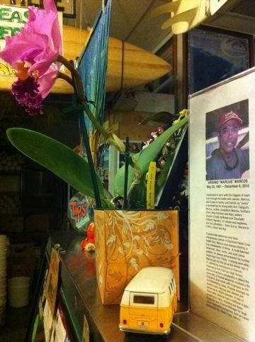 This oasis of life is the legacy of former owner Marcus Marcos, who died of cancer last December, aged 49. His portrait and accompanying memoriam are proudly displayed on the bar, and the walls feature photos of Marcus enjoying Oahu with his family & dogs.