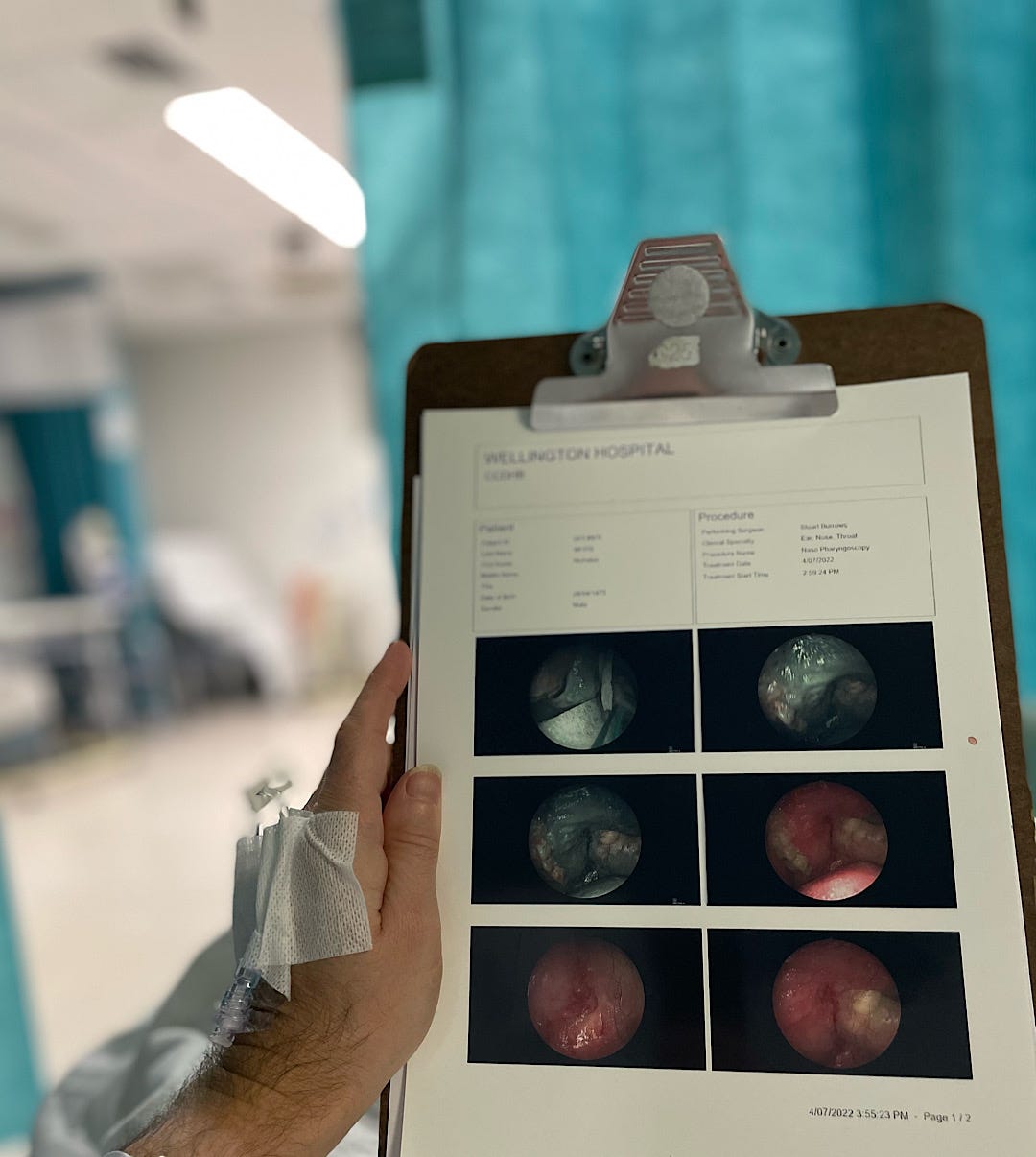 On Tuesday, I had a second ablation surgery at Wellington Hospital, similar to my operation a few weeks ago. It’s part of the treatment plan to remove precancerous areas in my upper palate.