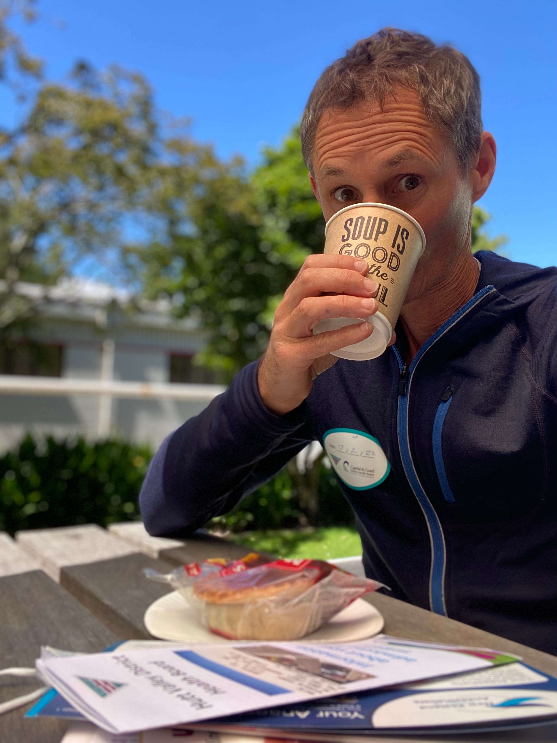 After providing my final few units of blood to the lab I decided to conduct my own preoperative assessment of the hospital food, checking out the Level 1 cafe. Moving swiftly past the salads, I followed doctors orders and went straight for the pies. For a drink, I went for the creamy soup.