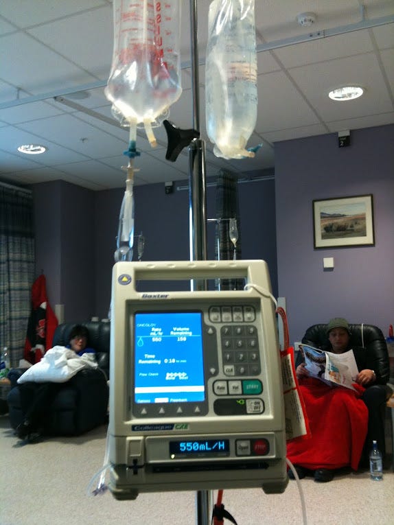 Once you have settled into your allotted space you are given an emaciated Dalek to look after for the day. A pale shadow of their former universe-conquering selves, today's chemo Dalek is a computerised pole-on-wheels with the role of administering your chemical infusions. Mine is called Baxter (I am not making that up).